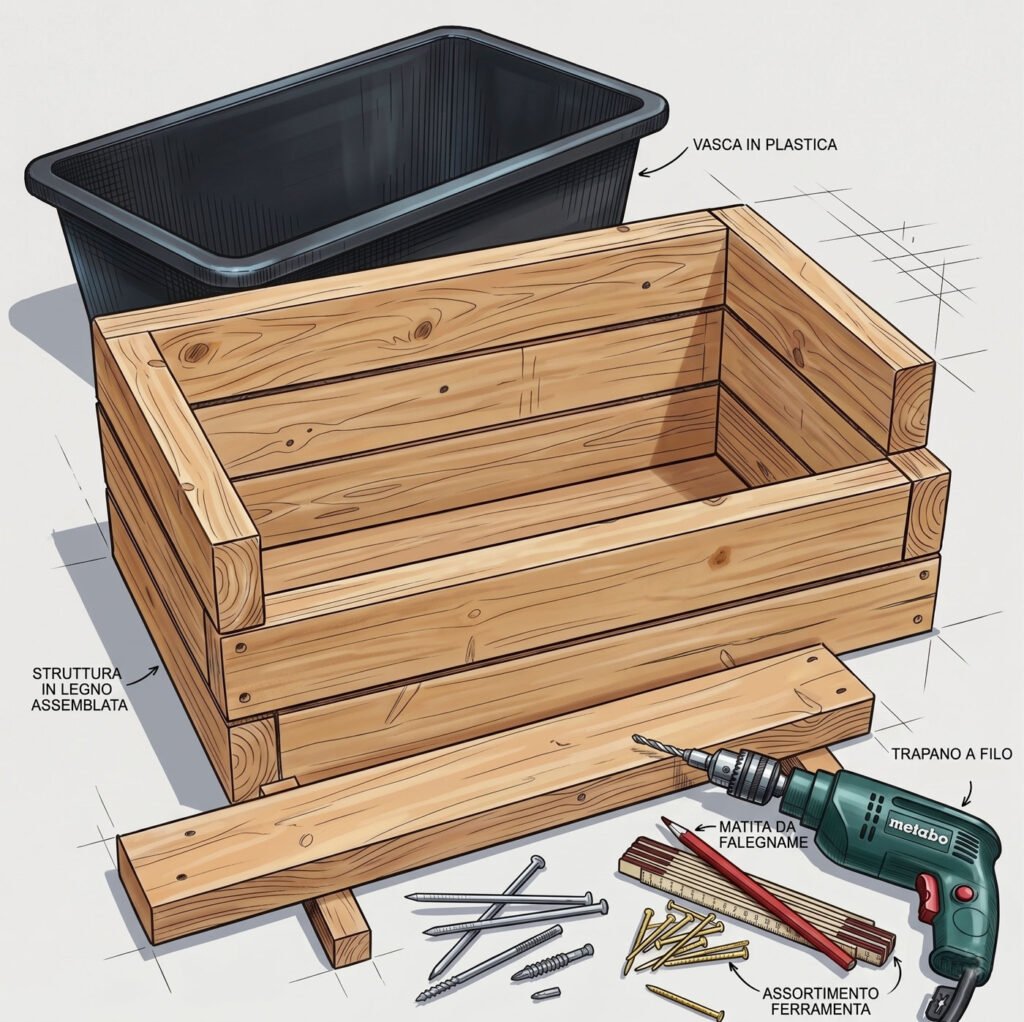 • Materiali consigliati: Listoni di legno trattato per esterni (come autoclave o larice).