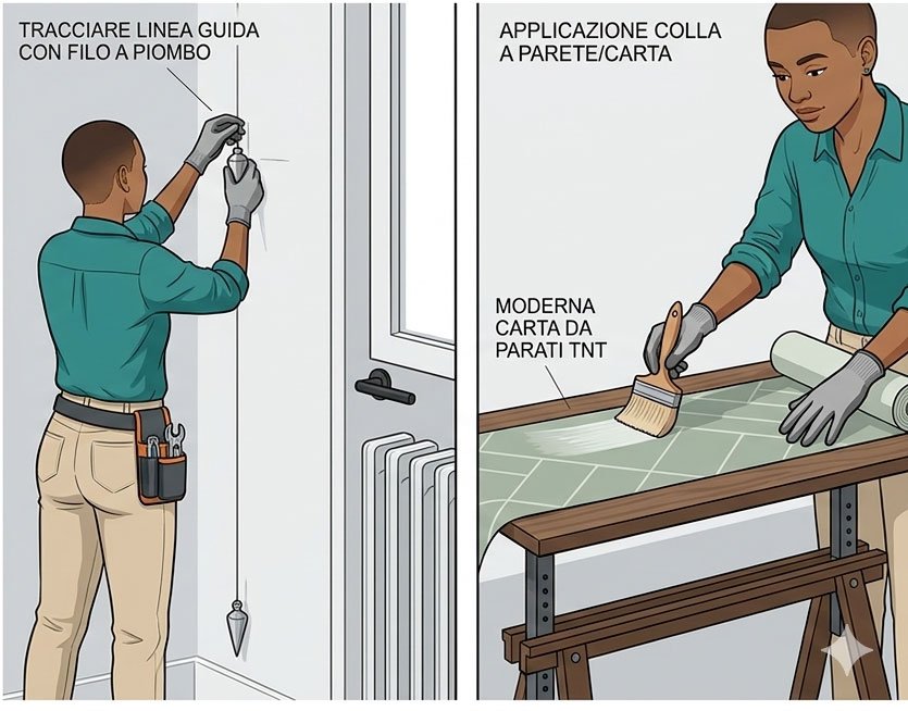 - Le giunzioni: Se usi carta vinilica, accosta i teli perfettamente a filo. Se usi carta comune, prevedi una sovrapposizione di circa 3 mm, poiché potrebbe ritirarsi leggermente asciugando.